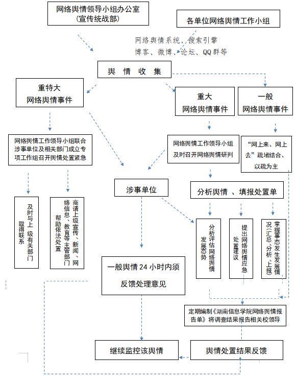 发现紧急舆情或发现重大舆情,宣传部舆情管理员或各信息员以“湖南信息学院网络舆情报告单”形式报送(视不同情况,向分管领导汇报的同时也可同时向主要领导汇报)→学院分管领导或值班领导→学院主要负责人
