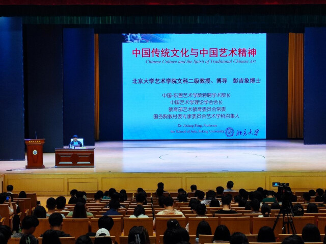 据悉,作为教育部艺术教育委员会常委,中宣部、教育部“马克思主义理论研究和建设工程”重大攻关课题《艺术学概论》首席专家,北京大学艺术学院原党委书记兼常务副院长、教授、博导,彭吉象有着深厚的理论基础。讲座伊始,彭吉象带来的话题是“中国美学与西方美学的比较”。中国传统美学和西方传统美学有很大的不同,中西方美学都追求真善美,但中国传统美学更加强调美与善的统一,而西方更多强调美与真的统一,侧重点不一样。彭吉象分别用欧洲的《荷马史诗》《哈姆雷特》和中国的《诗经》《楚辞》《秦香莲》《梁山伯与祝英台》《牡丹亭》《长生殿》以及当代电视连续剧《潜伏》等艺术作品进行了举例阐述。